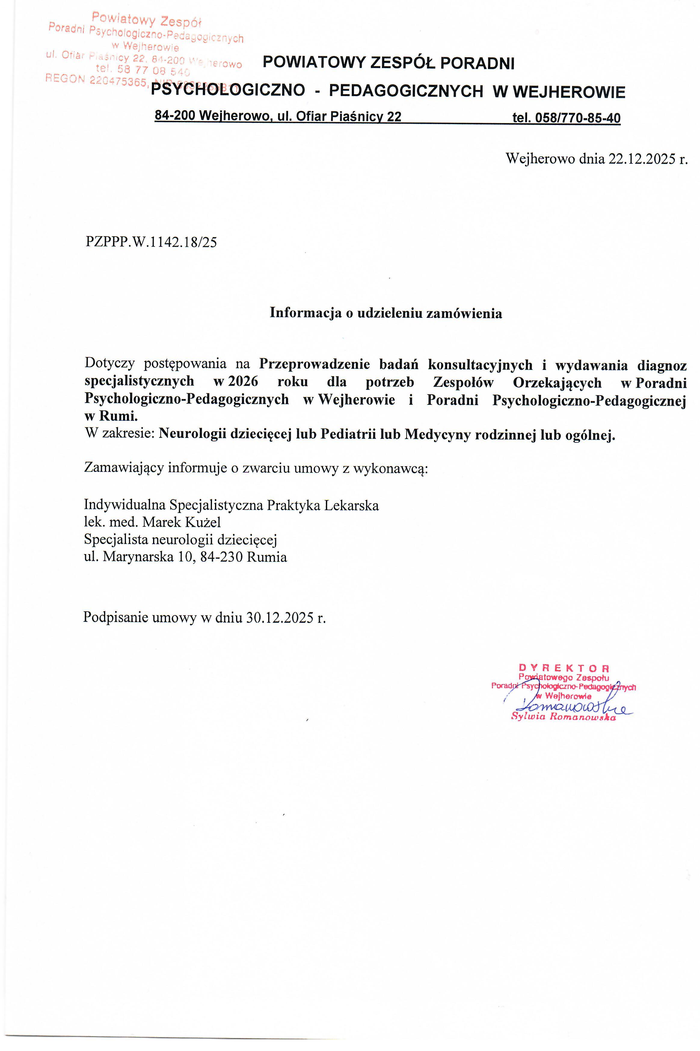 Zapytanie ofertowe na przeprowadzenie badań konsultacyjnych i wydania diagnoz specjalistycznych w 2026 r., na potrzeby Zespołów Orzekających w Poradni Psychologiczno-Pedagogicznych w Wejherowie i Poradni Psychologiczno-Pedagogicznej w Rumi.